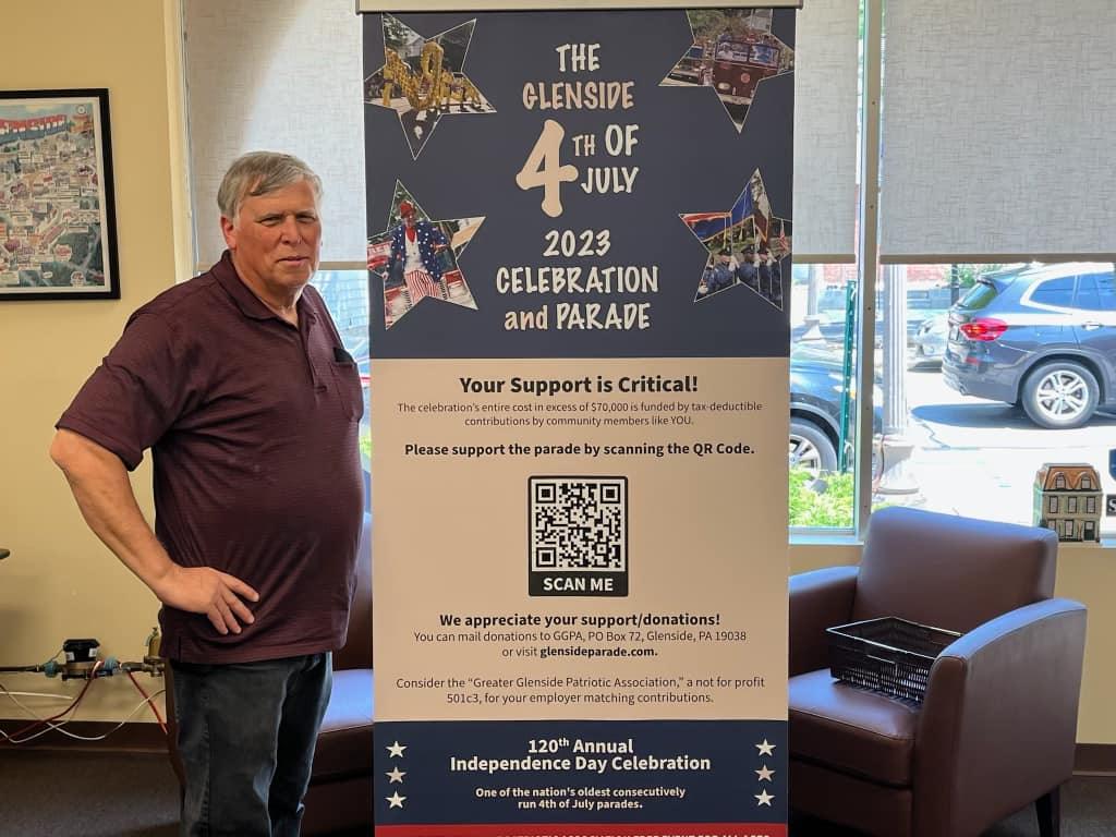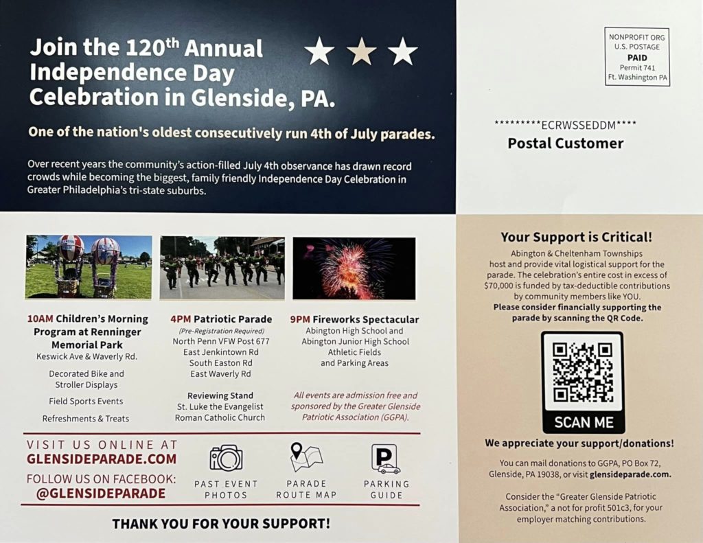 The poster-style flier replaces previous years’ mailers and envelopes to save on costs and features a QR code for donations which links directly to the Parade’s PayPal account. The parade’s organizers note that the festivities are fully funded by community members, and that donations can also be mailed to GGPA, PO Box 72, Glenside, PA, 19038.