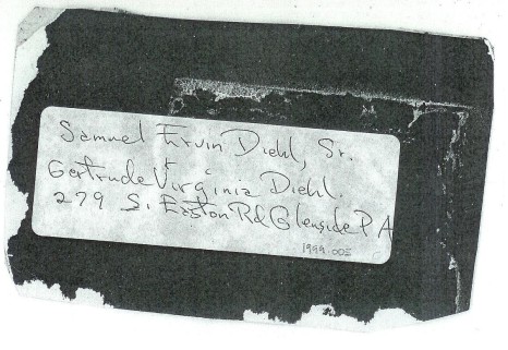 The estate of my great-grandparents Samuel Ervin Diehl, Sr. and Gertrude Virginia Addis Diehl. Using modern numbering, it was at 279 South Easton Road, Glenside. “It was built especially for them, and they were the only ones to ever live there. The family moved there from West Oak Lane [ Oak Lane ] in 1904…” – Mom. While Mom said it was destroyed by fire in 1937, the Glenside News reports that it actually burned March 12, 1940