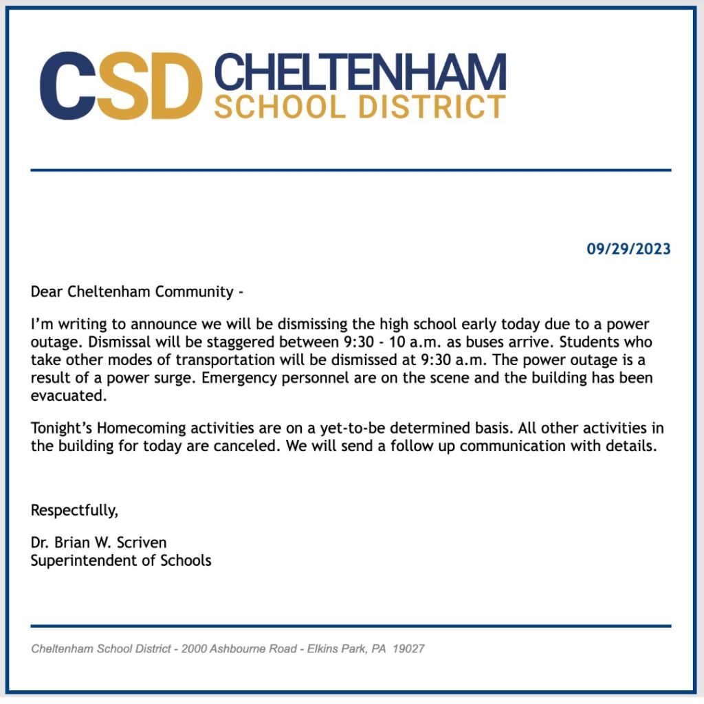 Multiple fire company units have been dispatched to Cheltenham High School for an electrical issue in the school’s “little gym,” according to a Facebook post from Emergency Alerts of Southeastern Pennsylvania at approximately 9:00am on Friday, September 29.