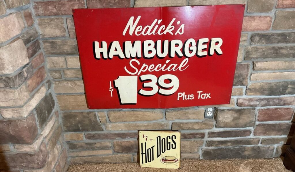 The sale includes a variety of vintage goods such as furniture (Victorian washstand, chairs, beds), tools, toys, and advertising.