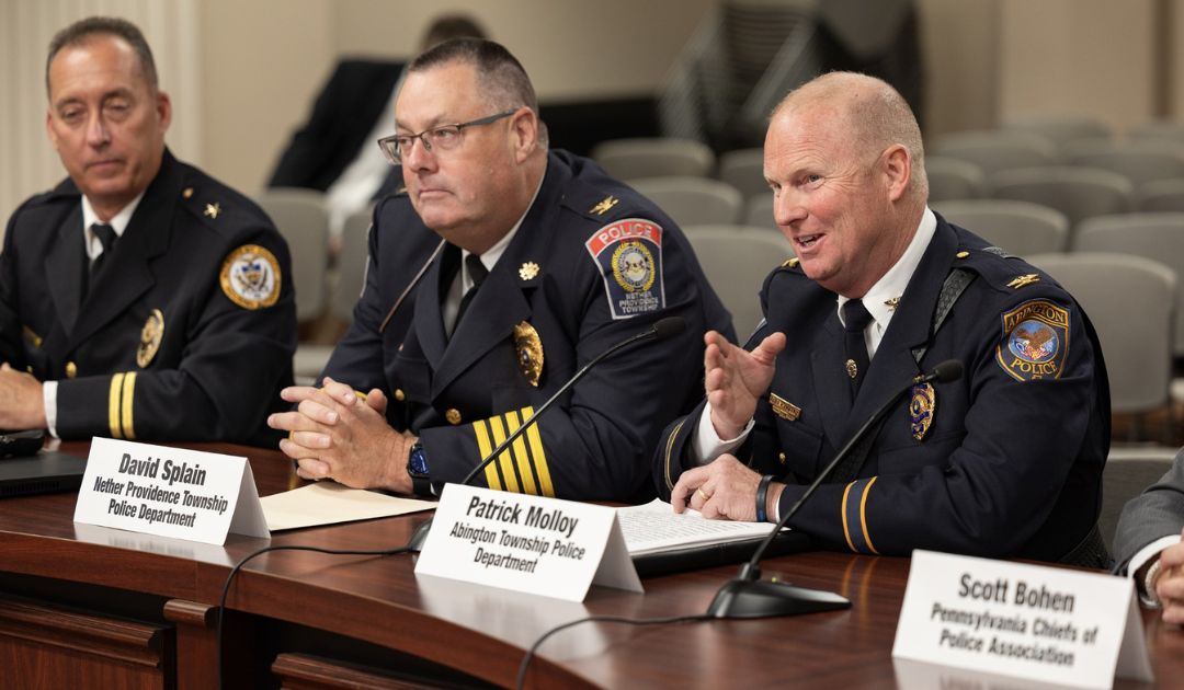 Chief Patrick Molloy, Abington Township Police Chief and President of the Southeast Pennsylvania Police Chiefs Association, with Chief David Splain, President of the PA Chiefs Association, Chief Scott Bohn and Chief Michael Vogel were honored to testify at last week’s Senate hearing on the challenges facing our law enforcement profession and those policies that continue to threaten the public safety and quality of life in the communities that they serve.