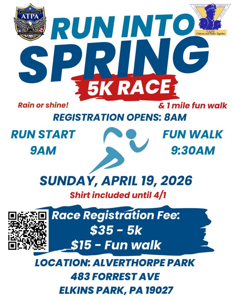 In related news, Abington police will host a “Run Into Spring” 5K race on Sunday, April 19 in Elkins Park.