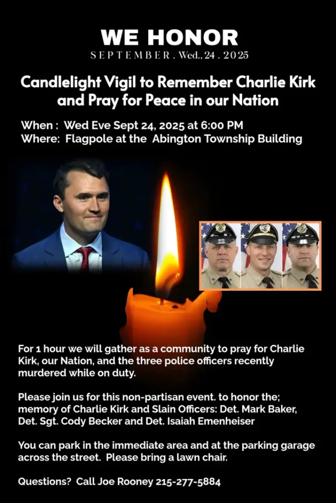 Joseph Rooney, an Abington resident and school board candidate, is hosting a candlelight vigil at 6:00pm on Wednesday, September 24 to honor political commentator Charlie Kirk and three recently murdered police officers: Detective Mark Baker, Detective Sergeant Cody Becker, and Detective Isaiah Emenheiser of York County.