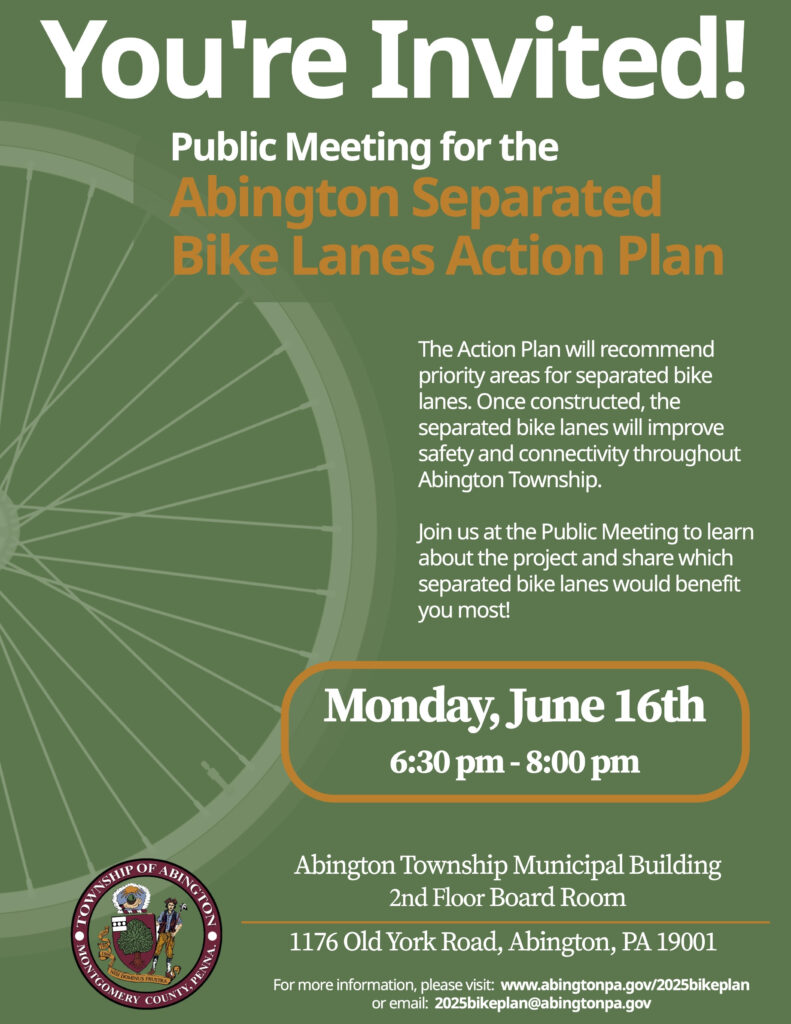 In related news, the township will also hold a public meeting for the Abington Separated Bike Lanes Action Plan on Monday, June 16. More details below: