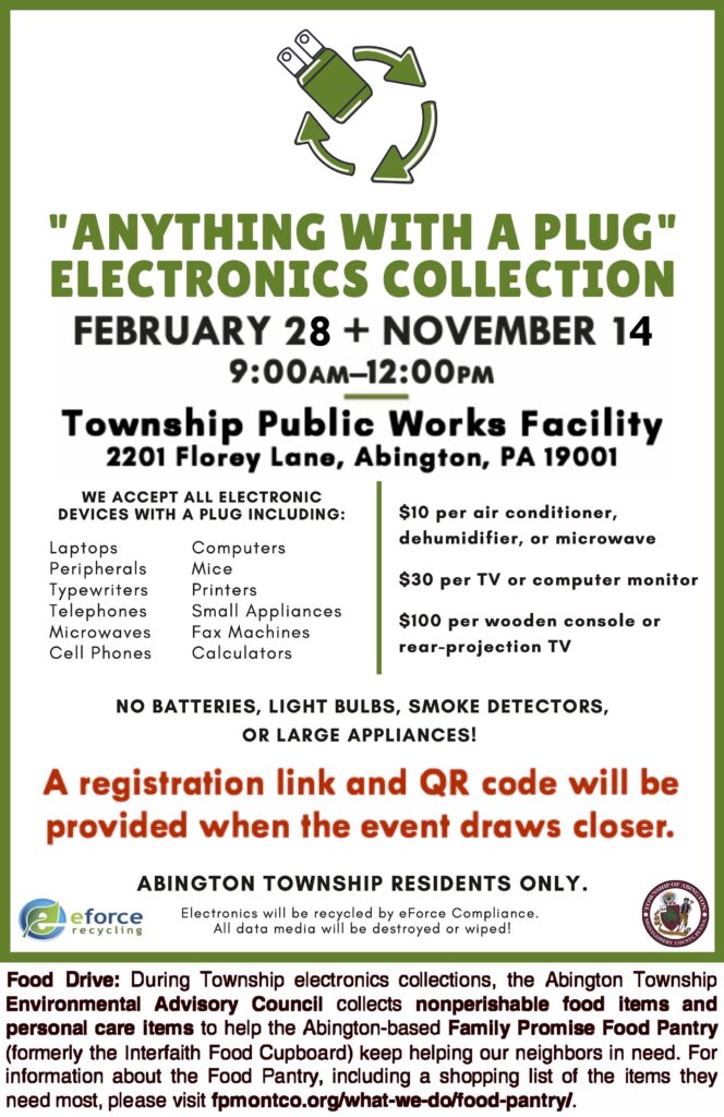 Abington Township will host an “Anything with a Plug” disposal event on Saturday, February 28 from 9:00am until 12:00pm at the Public Works Yard, 2201 Florey Lane.