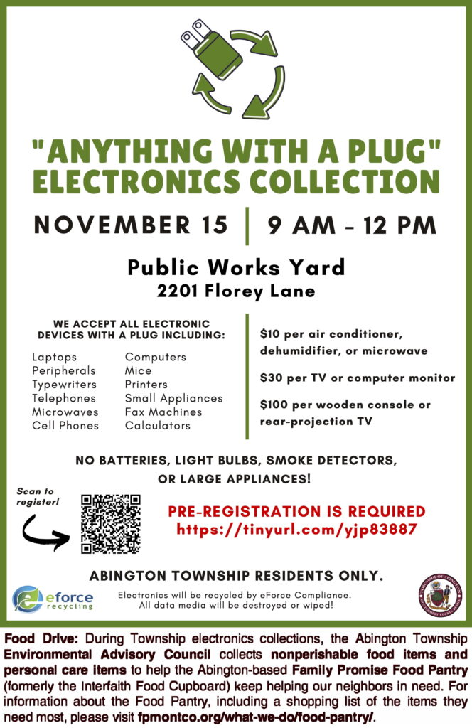 Abington Township will host an “Anything with a Plug” disposal event on Saturday, November 15 from 9:00am until 12:00pm at the Public Works Yard, 2201 Florey Lane.