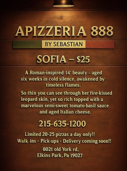 Apizzeria 888 by Sebastian, located at 8021 Old York Road in Elkins Park (Cheltenham Township), was featured by The Philadelphia Inquirer in an article titled “I’m obsessed with the pizza at this one-man shop in Elkins Park“.