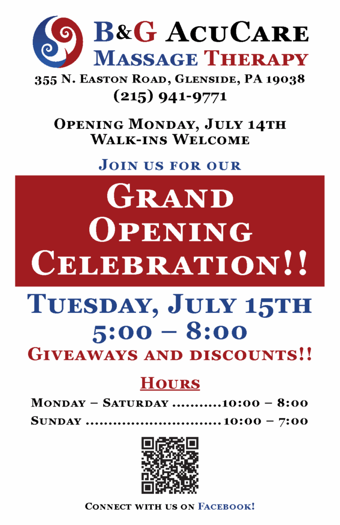 B&G AcuCare Massage Services will open for business on Monday, July 14 at 355 Easton Road in Glenside, the former home of Yoga Reverie.