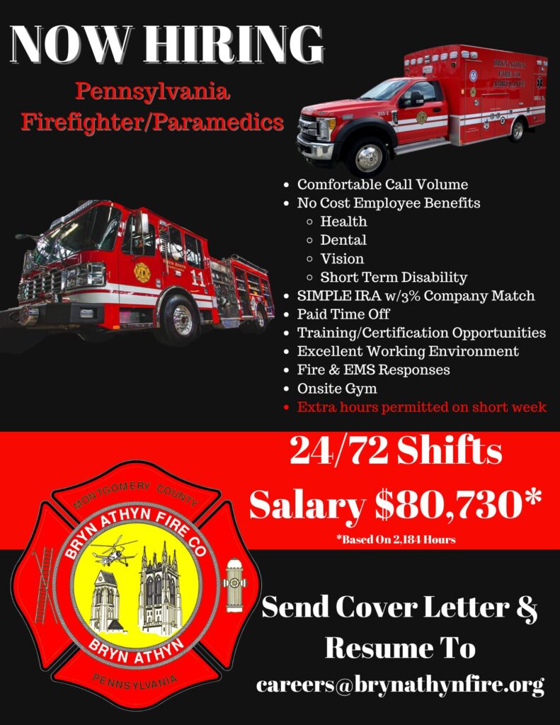 The Bryn Athyn Fire Company (Lower Moreland Township) is looking to hire a full-time firefighter/paramedic.