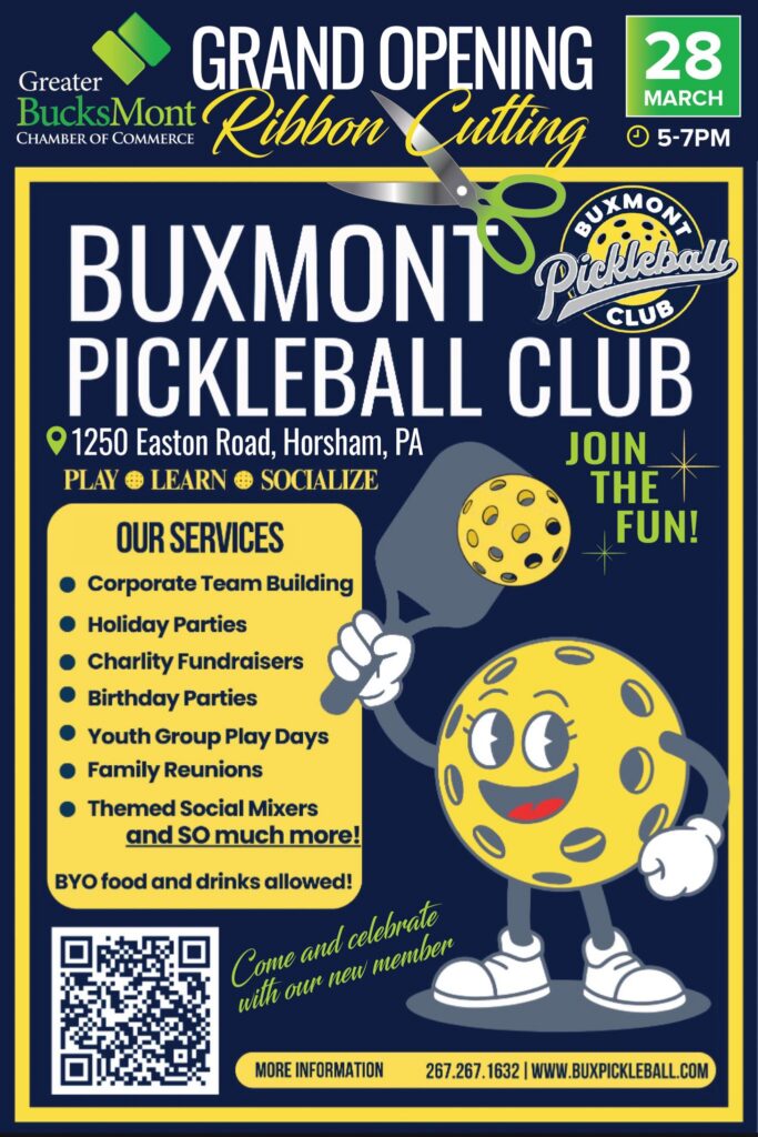 Buxmont Pickleball Club, located at 1250 Easton Road in Horsham, is hosting a grand opening on March 28 from 5:00pm – 7:00pm.