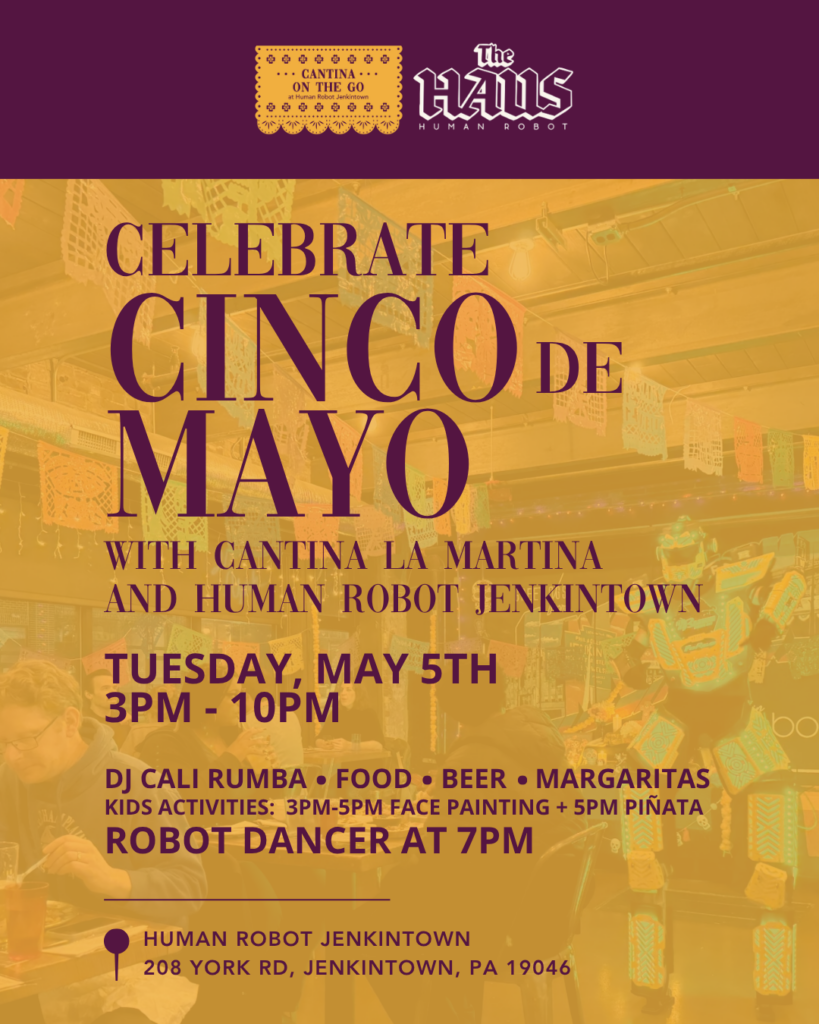 Cantina on the Go (located inside Human Robot Jenkintown) is hosting a Cinco de Mayo celebration on Tuesday, May 5 from 3:00pm to 10:00pm.