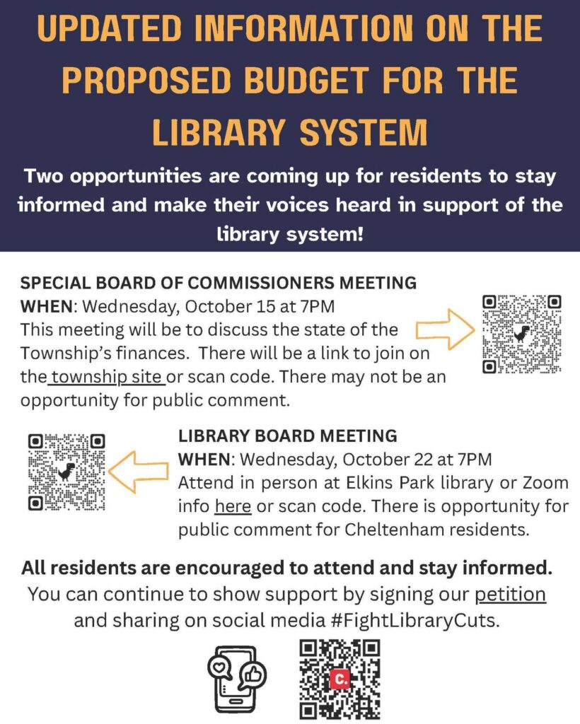 In early September, residents began circulating a petition titled “Fight Cheltenham Township Library Cuts!”. It has 377 signatures at the time of this writing. From the description: