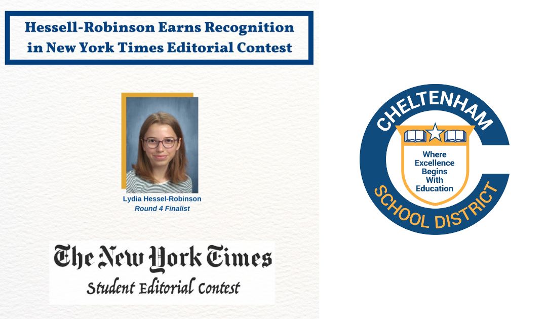 Cheltenham High School rising senior Lydia Hessel-Robinson was recently named a round four finalist of The New York Times’ 10th annual Student Editorial Contest.