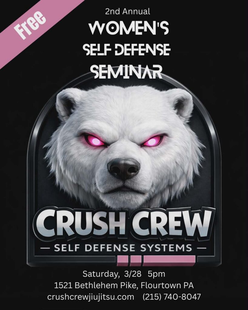 Crush Crew Jiu Jitsu, located at 1521 Bethlehem Pike in Flourtown (Springfield Township), is hosting a free self-defense seminar on Saturday, March 2 from 5:00pm – 6:30pm.