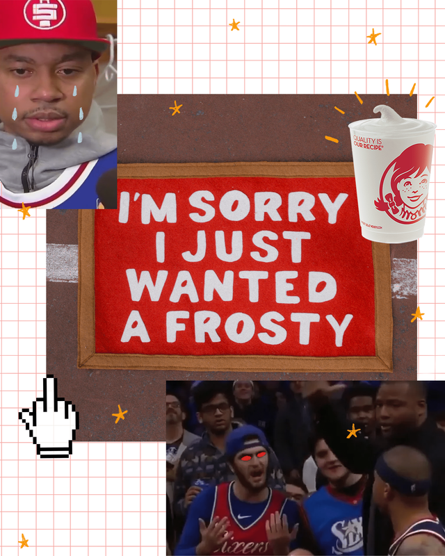 According to the story, Victor’s sports-centric multimedia work includes an Allen Iverson sweater vest, fan zines, and banners reading, “Find a New Slant” and “I’m Sorry I Just Wanted a Frosty”.