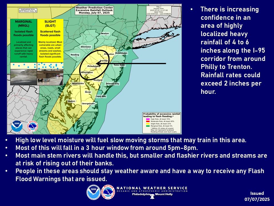 The National Weather Service announced today that as much as 4-6 inches of heavy rain is expected along the I-95 corridor from around Philly to Trenton this afternoon/evening.