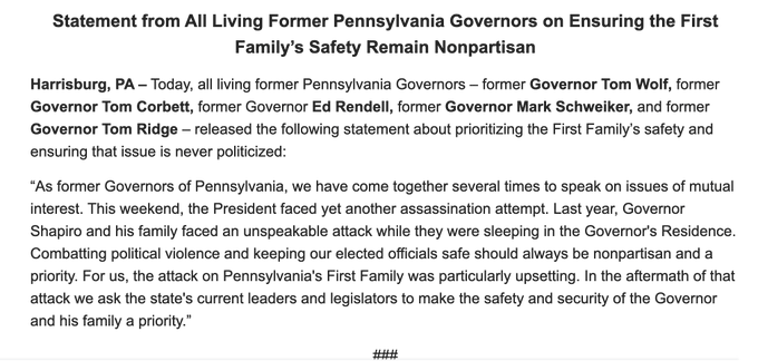 The statement was signed by former governors Tom Wolf, Tom Corbett, Ed Rendell, Mark Schweiker, and Tom Ridge, and calls for lawmakers to ensure the safety of Shapiro and his family.