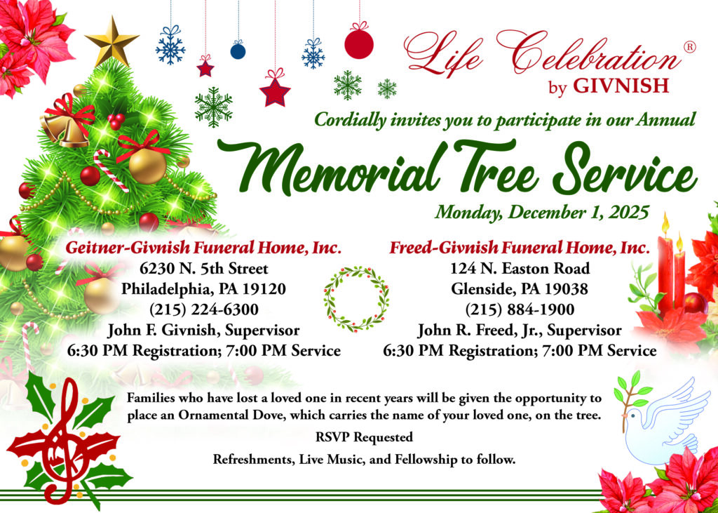The Freed-Givnish Life Celebration Home, located at 124 N Easton Road in Glenside, is hosting their annual Memorial Tree Service on Monday, December 1 at 7:00pm.