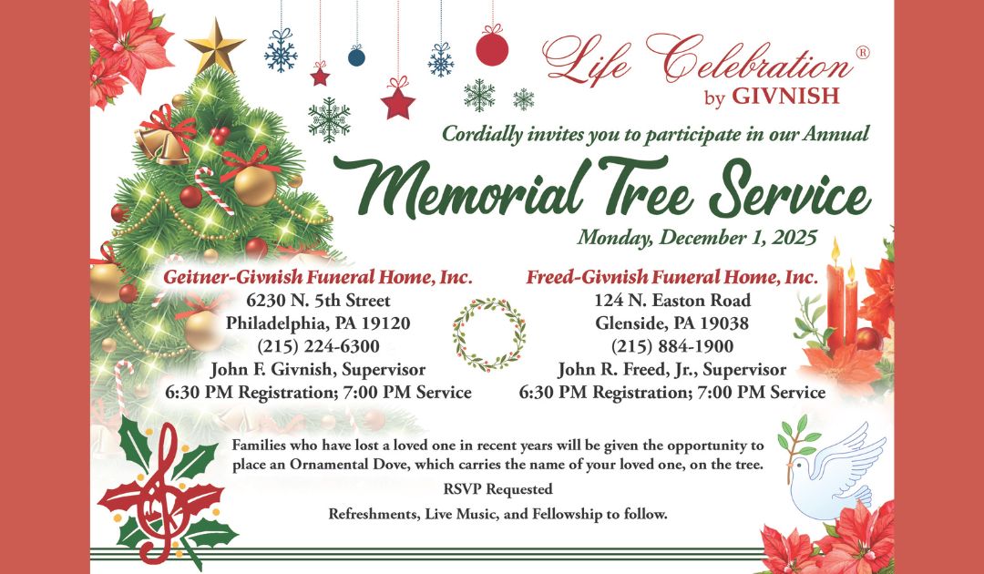 The Freed-Givnish Life Celebration Home, located at 124 N Easton Road in Glenside, is hosting their annual Memorial Tree Service on Monday, December 1 at 7:00pm.