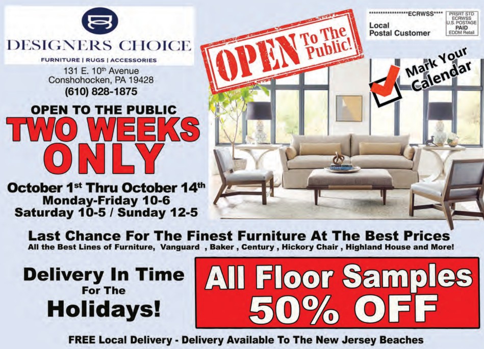 Designer’s Choice (131 East 10th Avenue) in Conshohocken is opening its showroom to the public for the first time in two years, from October 1st to October 14th, and will be offering all floor samples at 50% off! Designer’s Choice is the company that sprang from Light-Parker Furniture, which was located at the corner of West 1st Avenue and Fayette Street for over 50 years.