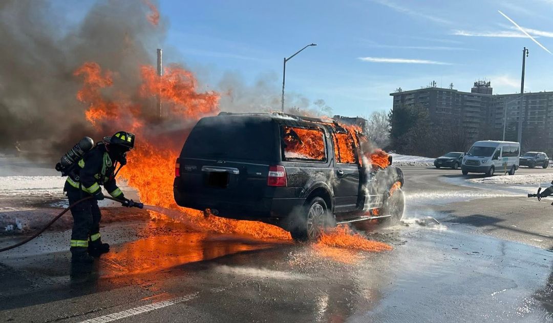 “The crews of Engine 1-1 and Engine 1 stretched 3 booster lines to extinguish the fully-involved SUV,” the company said in a post.