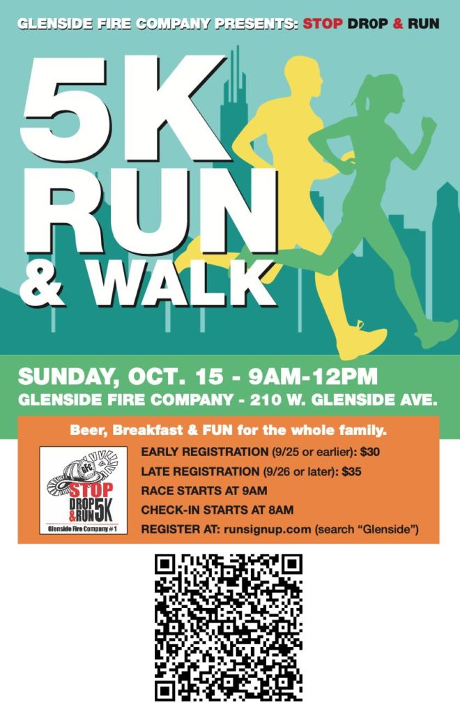 The Glenside Fire Company’s annual Stop, Drop & Run 5K will take place on Sunday, October 15 from 9:00am to 12:00pm and will begin at 210 W. Glenside Avenue.