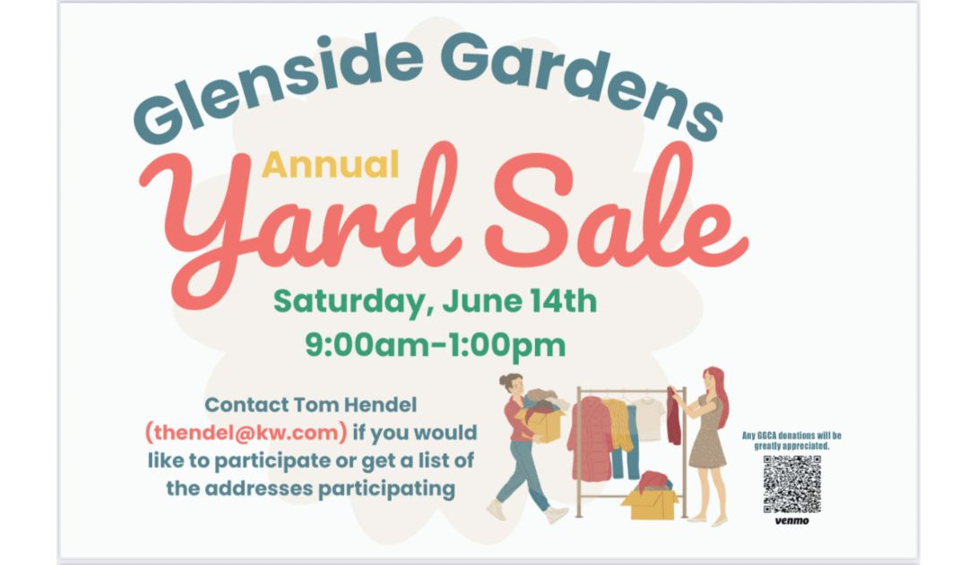 The annual Glenside Gardens Yard Sale will take place on Saturday, June 14 from 9:00am – 1:00pm between Easton Road, Jenkintown Road, Highland Avenue, and Charles Street.