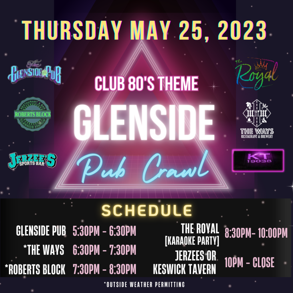 The revamped Glenside Pub Crawl has been scheduled for Thursday, May 25 from 5:30pm – Closing Time.