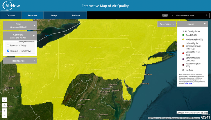 Most of the state is forecast to see air quality index levels in the mid-60s throughout Monday, and Tuesday will also see moderate air quality levels throughout most of Pennsylvania, according to airnow.gov.