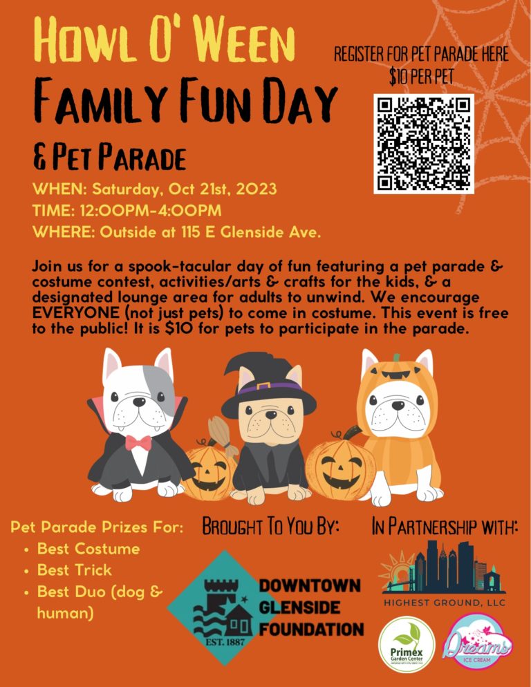 The Downtown Glenside Foundation’s second annual Howl O’Ween Family Fun Day & Pet Parade will take place on Saturday, October 21 from 12:00pm to 4:00pm at 115 E. Glenside Avenue, and will feature pet vendors and family activities, including games for kids, food, drinks, live music, a lounge area for adults, and more.