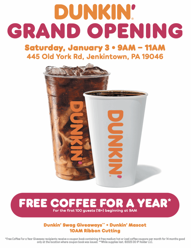 The Dunkin’ at 445 Old York Road in Jenkintown is hosting a Grand (Re)Opening on Saturday, January 3 from 9:00am – 11:00am. A ribbon cutting will take place at 10:00am.
