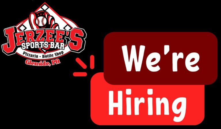 Jerzee’s Sports Bar & Pizzaria in Glenside is looking to hire a bartender/server and a takeout delivery person.
