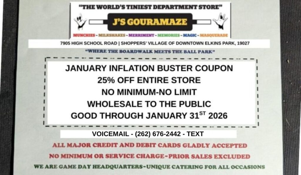 J’s Gouramaze in the Shoppers’ Village in downtown Elkins Park (Cheltenham Township) is now offering a “January Inflation Buster Coupon”.