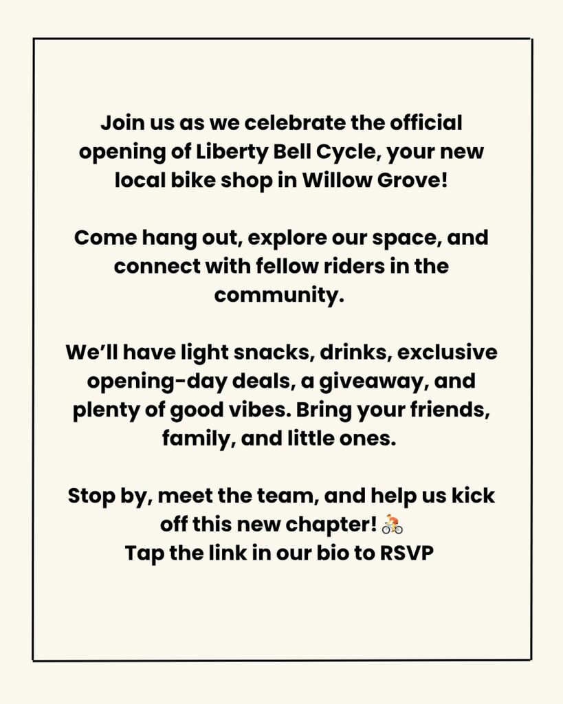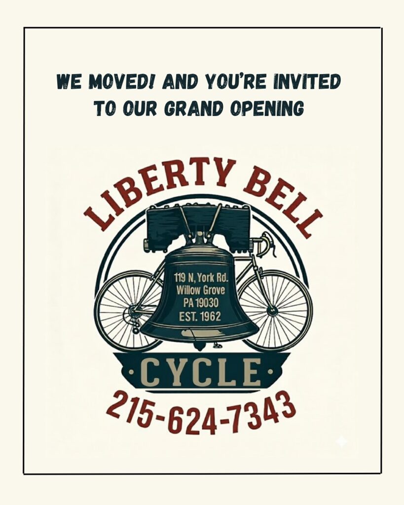 Liberty Bell Bicycle, located at 119 N York Road in Willow Grove (Upper Moreland Township), will host a grand opening from 11:00am to 3:00pm on Saturday, November 22.