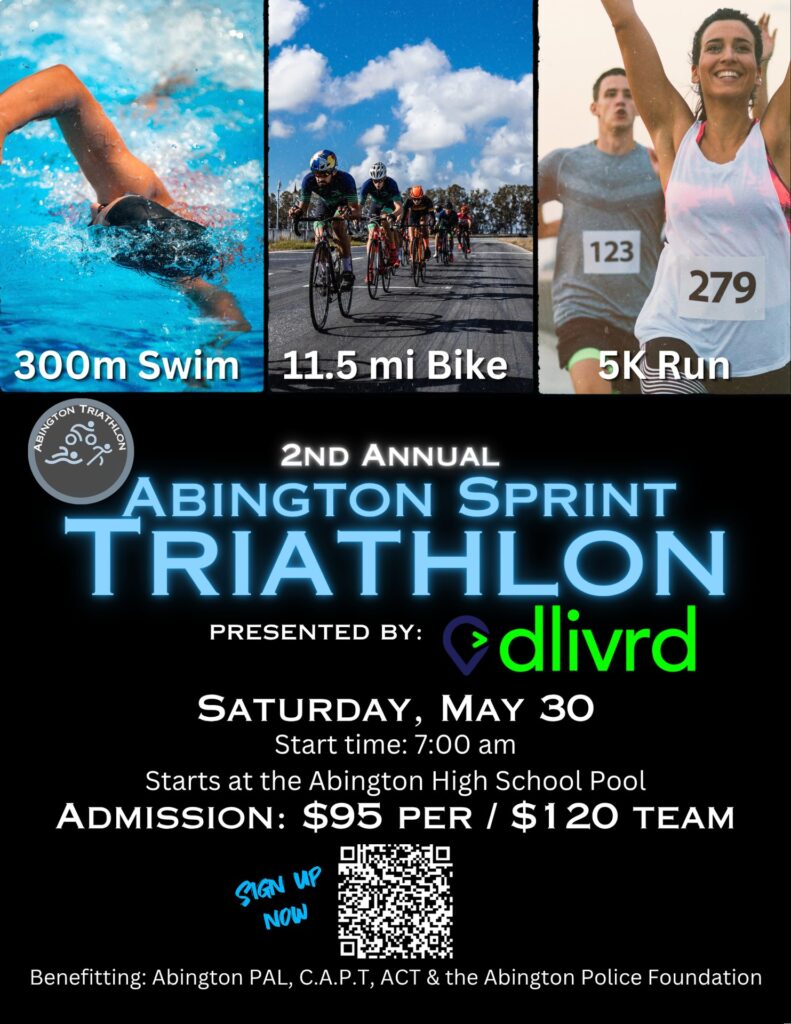 Race options include the Triathlon, Team Triathlon, and Aqua Bike and Duathlon. Proceeds from the events will go towards Abington C.A.PT., Abington P.A.L., and the Abington Community Taskforce.