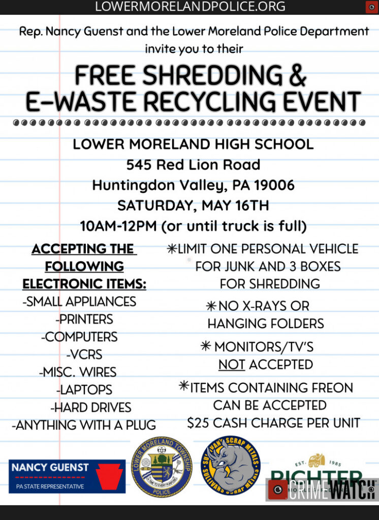 Representative Nancy Guest and the Lower More Police Department are hosting a free shredding and E-waste recycling event on Saturday, May 15 from 10:00am – 12:00pm at Lower Moreland High School (545 Red Lion Road, Huntingdon Valley).