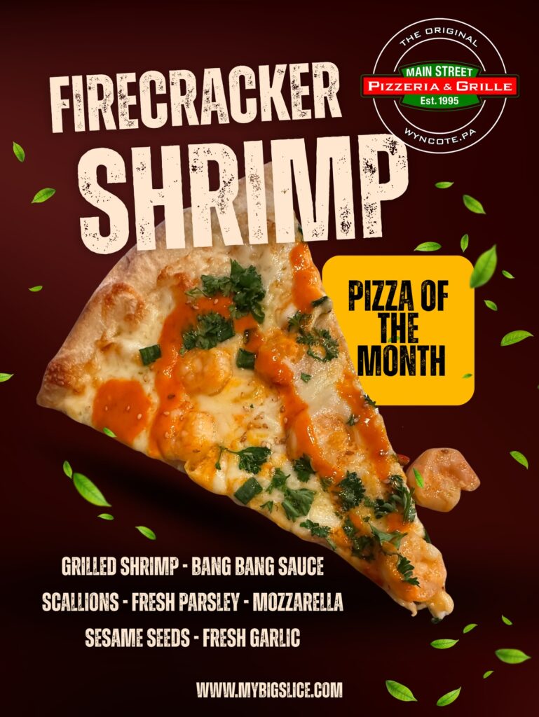 Main Street Pizzeria is expanding: the restaurant now has a brand-new patio with 35 seats and has applied for an in-house wine license. The Tornettas also do a “Pizza of the Month”: January’s edition is called “Firecracker Shrimp”.