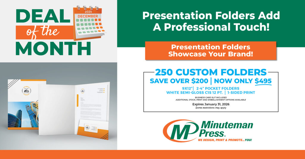 Minuteman Press, located at 359 N. Easton Road in Glenside, is offering 250 custom folders at a discount as part of the shop’s Deal of the Month.