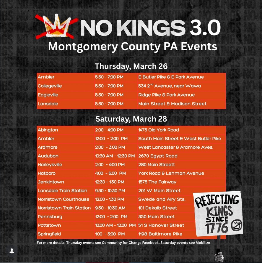 A “No Kings” protest has been scheduled from 12:30pm – 1:30pm on Saturday, March 28 at 1575 The Fairway in Jenkintown.