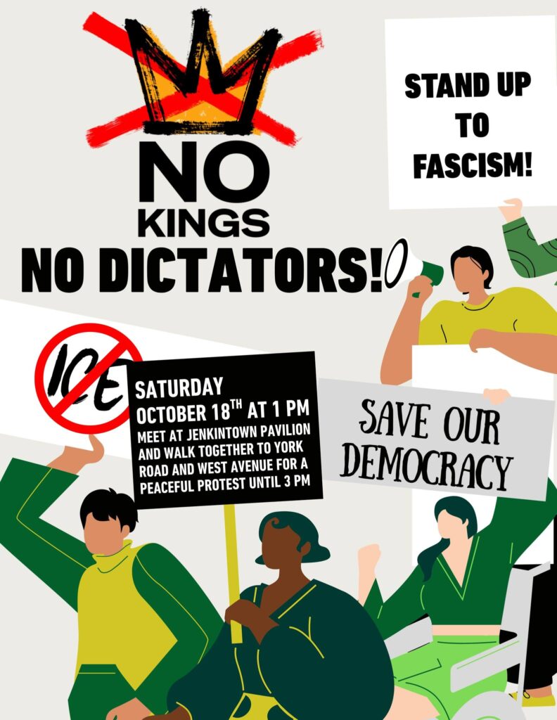 Local residents are meeting at the Jenkintown Borough pavilion in Town Square on Saturday, October 18 at 1:00pm for a “No Kings” protest.