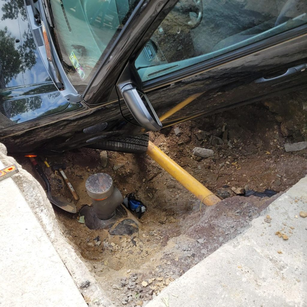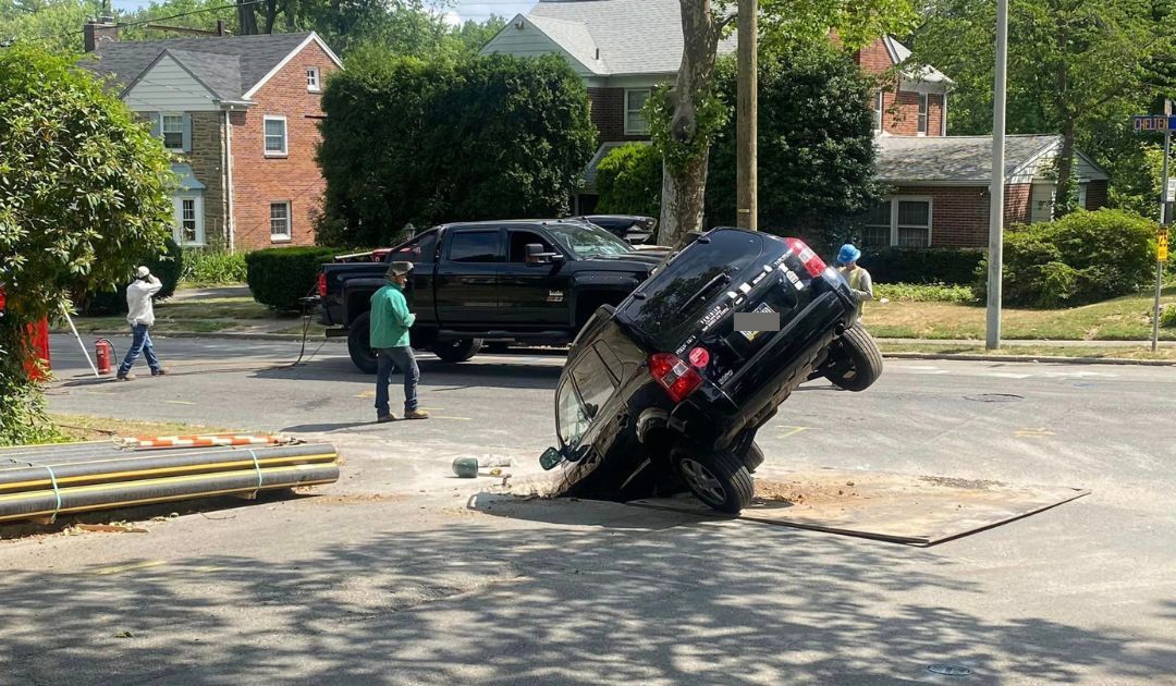 The driver who encountered this PECO gas main work at Chelten Hills Dr and Heather Rd has learned this lesson. Fortunately, construction personnel were not in this hole when the vehicle went around the closure point, and the two exposed gas mains were not struck, which would have resulted in a much worse situation.
