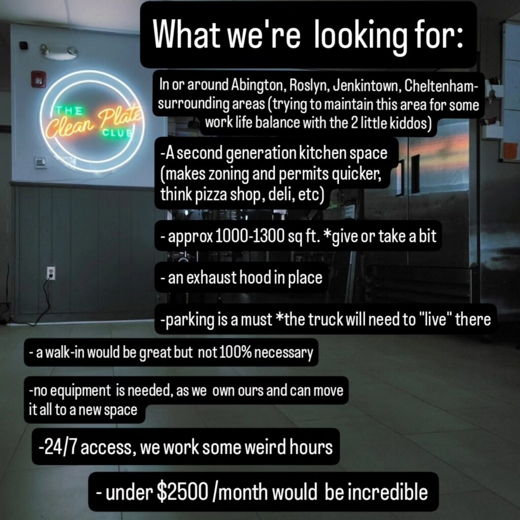 Sara and Keith Dreitlein, Glenside residents and owners of The Clean Plate Club in Abington, are looking for a new home for their commissary kitchen.