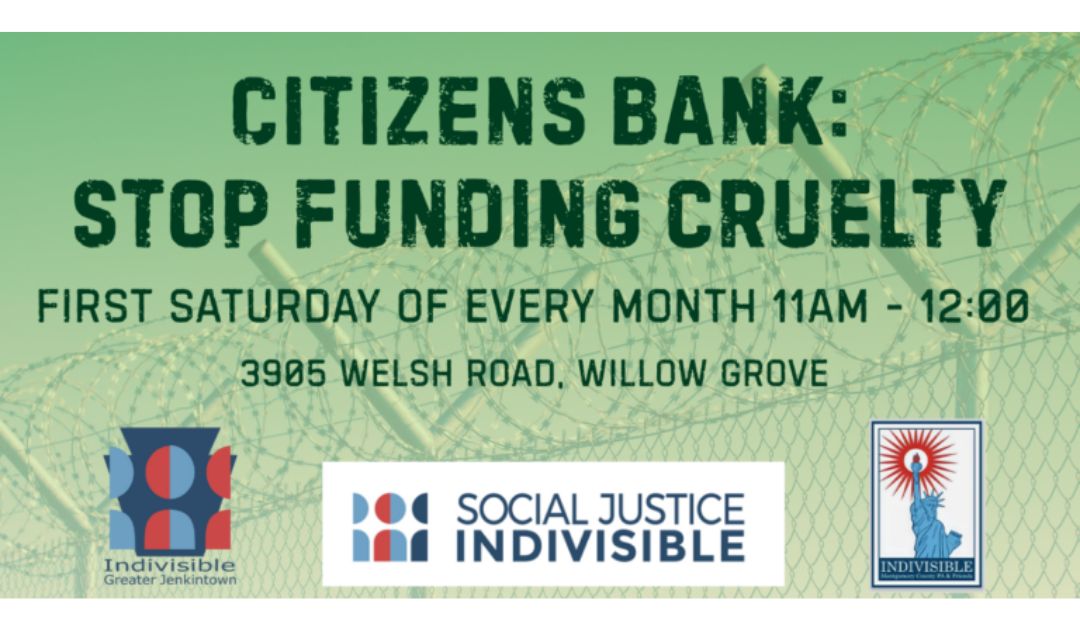 Right here in Pennsylvania, GEO operates the Moshannon Valley Processing Center, the largest ICE detention facility in the Northeast, just three hours from Montgomery County. Join us– and others statewide– to tell Citizens Bank that we want them to stop supporting cruelty.