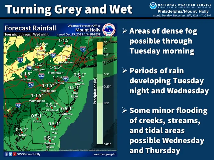 The National Weather Service is forecasting heavy rain beginning early Wednesday morning, and possibly continuing in a lighter form until Friday, December 29.