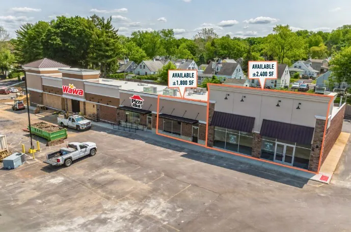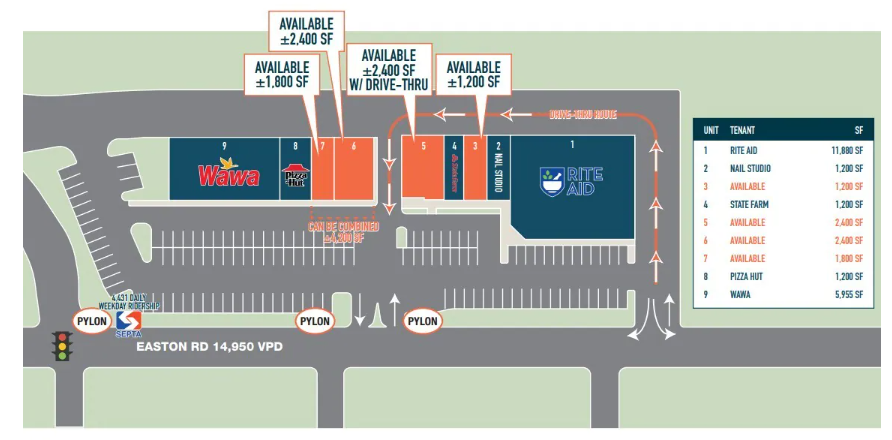 The shopping center is currently occupied by a recently opened Pizza Hut “Delivery & Wings”, a Nail Studio, a Rite Aid, a State Farm Insurance, and a soon-to-be-opened Wawa convenience store.