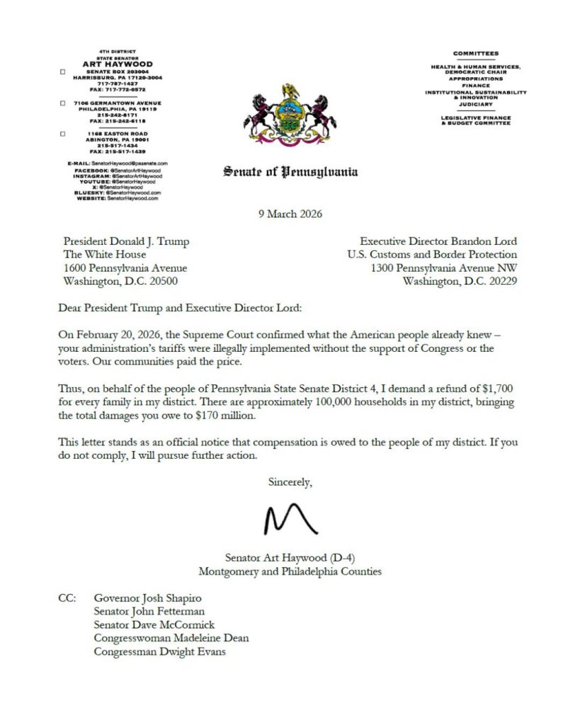 Senator Art Haywood, whose office is in Abington Township, announced today that he has sent a letter to President Donald Trump “demanding that he pay back over $170 million owed to the people of our district from his illegal tariffs.”