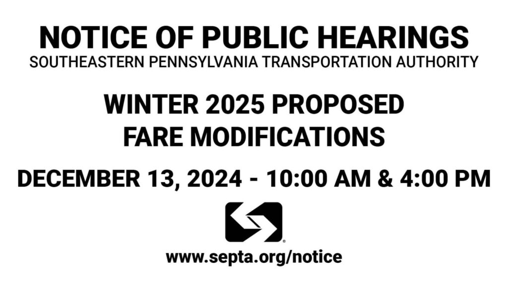 SEPTA will hold public hearings regarding the proposed fare adjustments on December 13 at 10:00am and 4:00pm, during which the proposed fare changes will be presented. The hearing will take place at the Pennsylvania Convention Center, 1101 Arch Street, Philadelphia, or remotely via virtual conferencing.