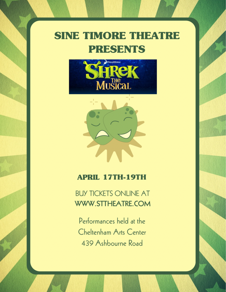 Sine Timore Theatre Company in Abington Township is hosting performances of Shrek the Musical on Friday, April 17 at 7:00pm, Saturday at 2:00pm and 7:00pm, and Sunday at 2:00pm at the Cheltenham Center for the Arts.