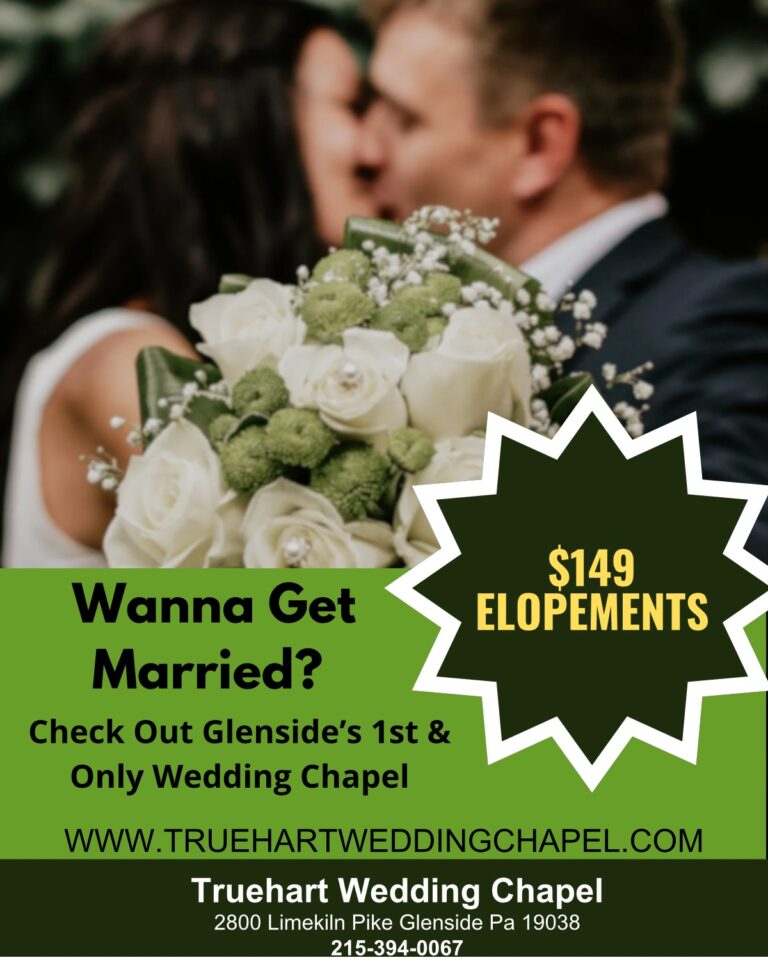 Say ‘I do’ at Truehart Wedding Chapel — Glenside’s most popular wedding chapel. Simple, affordable elopements starting at $149. Visit TruehartWeddingChapel.com today.