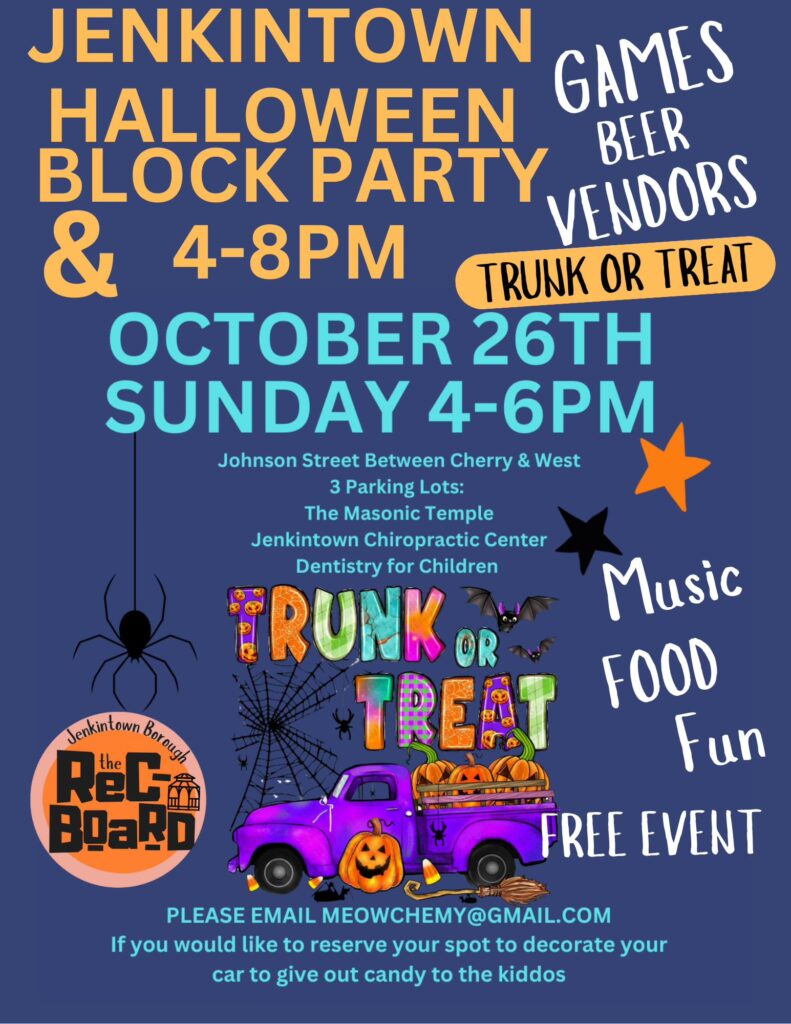 The Jenkintown Borough Recreation Board is hosting a Trunk or Treat & Halloween Block Party on Saturday, October 26 from 4:00pm – 8:00pm on Johnson Street between West & Cherry.